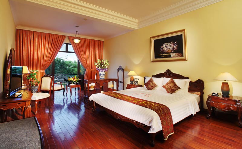 Phòng được lát sàn gỗ, phòng tắm được lát đá cẩm thạch tạo cảm giác sang trọng nhưng cũng gần gũi với du khách. Các tiện nghi phòng ngủ và phòng tắm luôn được nhân viên khách sạn chuẩn bị chu đáo để phục vụ du khách.