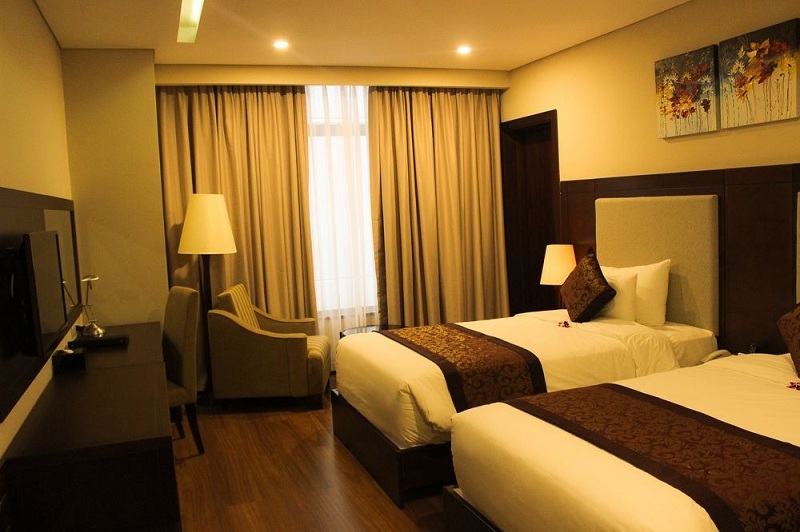 Phòng 2 giường đơn được trang bị minibar, máy lạnh và ấm đun nước điện.