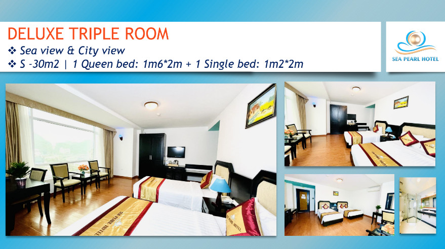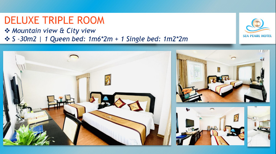 1.5. Phòng Deluxe Triple Sea view và City view: Mỗi phòng của hạng phòng này có diện tích 32m2 được thiết kế với không gian trang nhã là sự lựa chọn thích hợp dành cho những du khách đến nghỉ dưỡng cùng gia đình. Phòng được bố trí 1 giường đôi và 1 giường đơn cùng với những tiện nghi cần thiết vậy nên du khách có thể yên tâm nghỉ ngơi thoải mái.