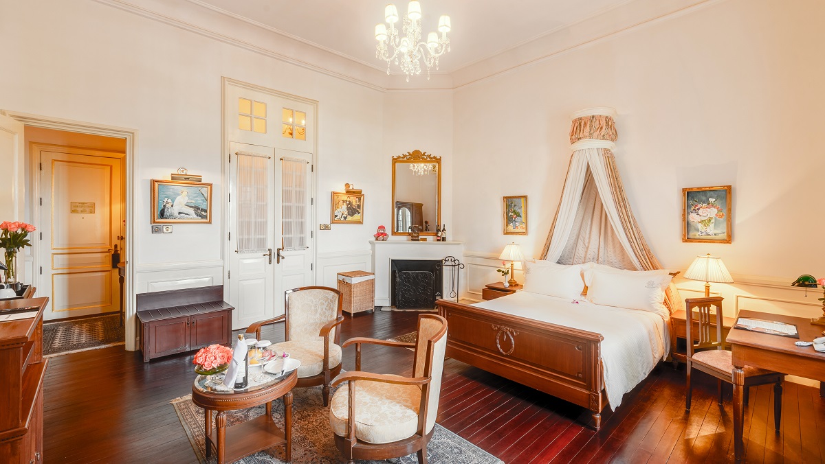 Phòng Presidential Suite sang trọng này phải được nhìn thấy mới có thể tin được: hoàn toàn như sân khấu và biểu diễn, với tông màu trắng và be sâu rực rỡ, đồ cổ phong phú, Phòng Tổng thống 2 phòng ngủ ngoạn mục và không thể cưỡng lại được phủ bằng các loại vải sang trọng và cổ kính cùng phòng tắm tinh tế bằng tay ngói màu lam góp phần tạo nên cảm giác “Thuộc địa Pháp Époque”. Một phòng khách lớn theo phong cách thời Edward với lò sưởi, tủ sách, tất cả đều màu be và trắng, nhẹ nhàng và đáng yêu với những điểm nhấn kiểu Pháp nằm ở giữa Phòng Tổng thống. Căn phòng này kết nối với phòng 2 giường đơn sáng sủa và thoáng mát thú vị và ngon miệng bên cạnh, một lần nữa có cùng tông màu và nhiều không gian sinh hoạt.